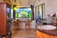 • Красивый обеденный уголок напротив окна с витражами, из которого открывается вид на фруктовый сад